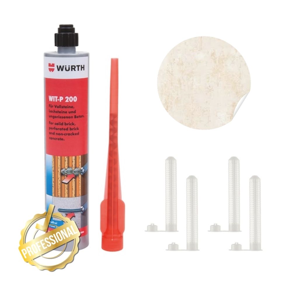 Pour garantir une fixation fiable de votre voile d’ombrage dans un support creux (parpaing ou brique), nous fournissons un jeu de pose complet comprenant un tamis et un scellement chimique professionnel Würth.